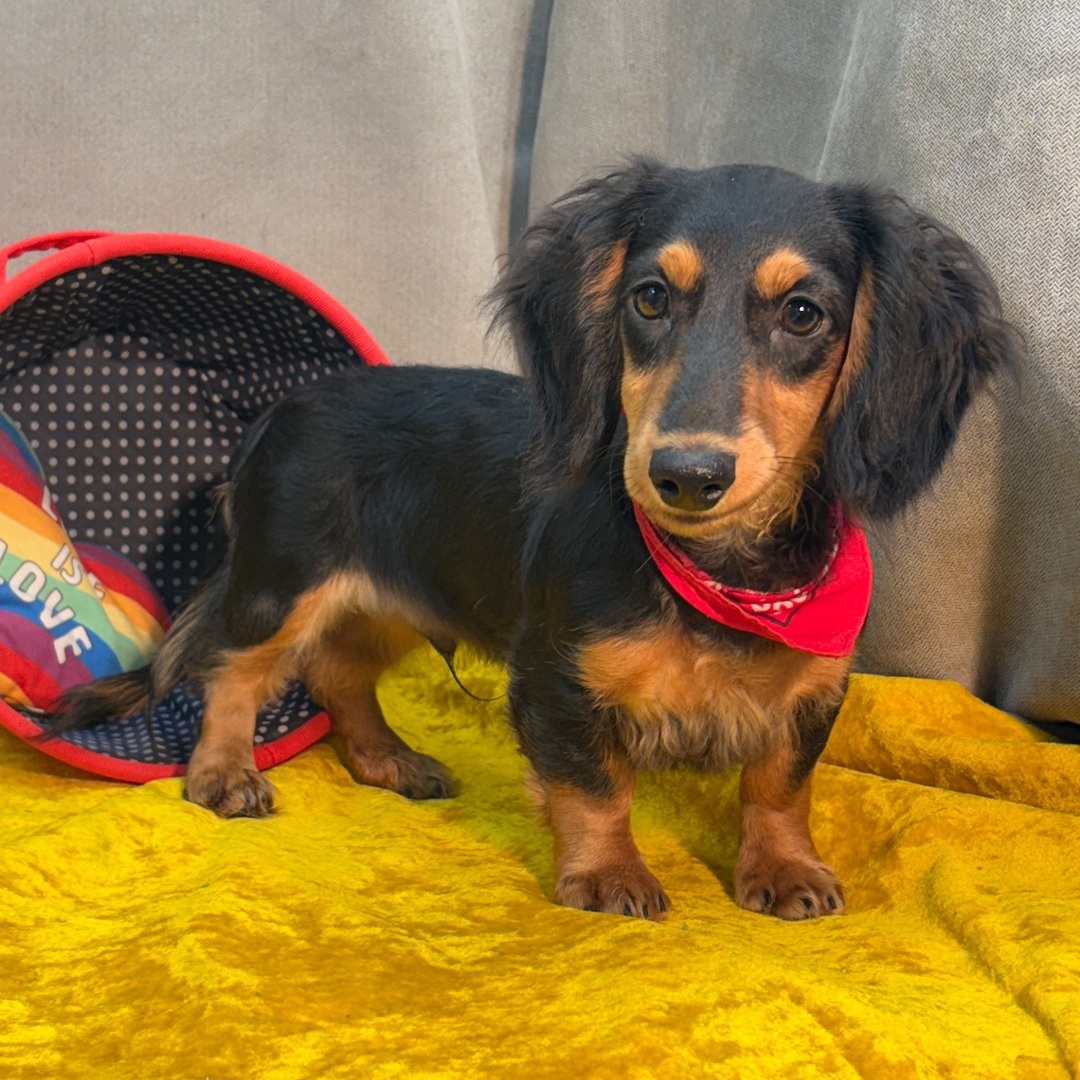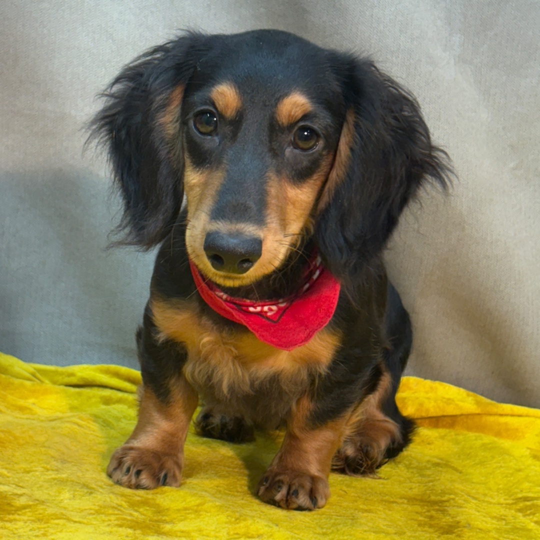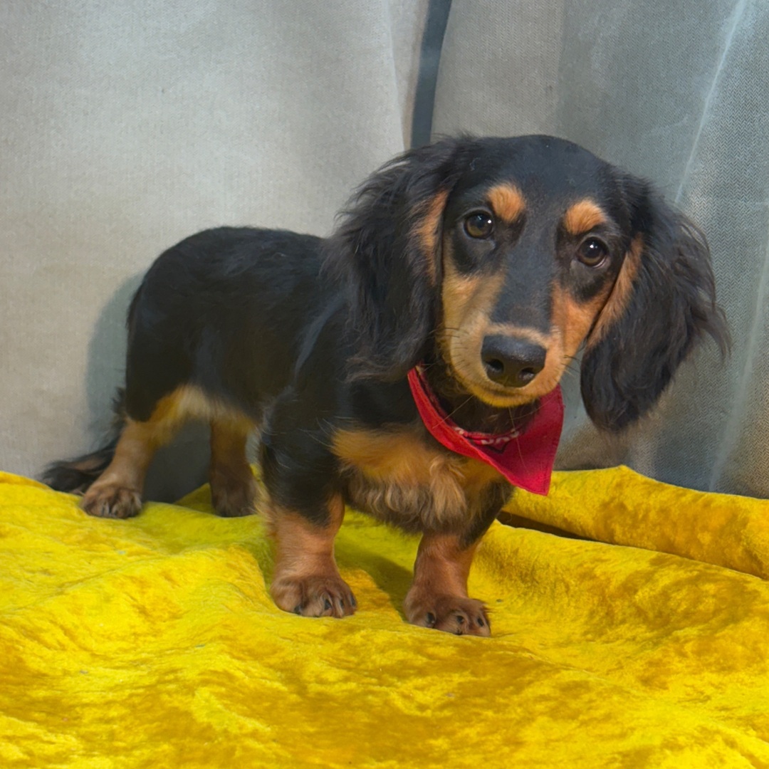 Say hello to Gordon, a charming 20-week-old male Dachshund puppy with a striking black and tan long-haired coat and a heart as warm as his cuddles. Gordon is full of personality — playful, curious, and affectionate — ready to make every day brighter with his joyful spirit and endless love.