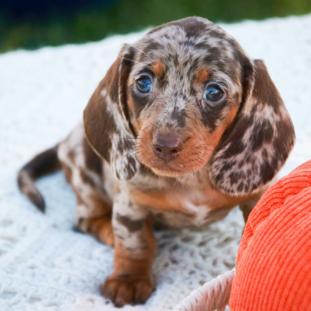 Say hello to Reeses, a stunning 8-week-old Miniature Dachshund with a one-of-a-kind Chocolate Dapple coat and a heart full of love! This little girl is as sweet as her name — full of charm, curiosity, and affection. With her soulful eyes and tiny wagging tail, Reeses is guaranteed to melt your heart the moment you meet her.